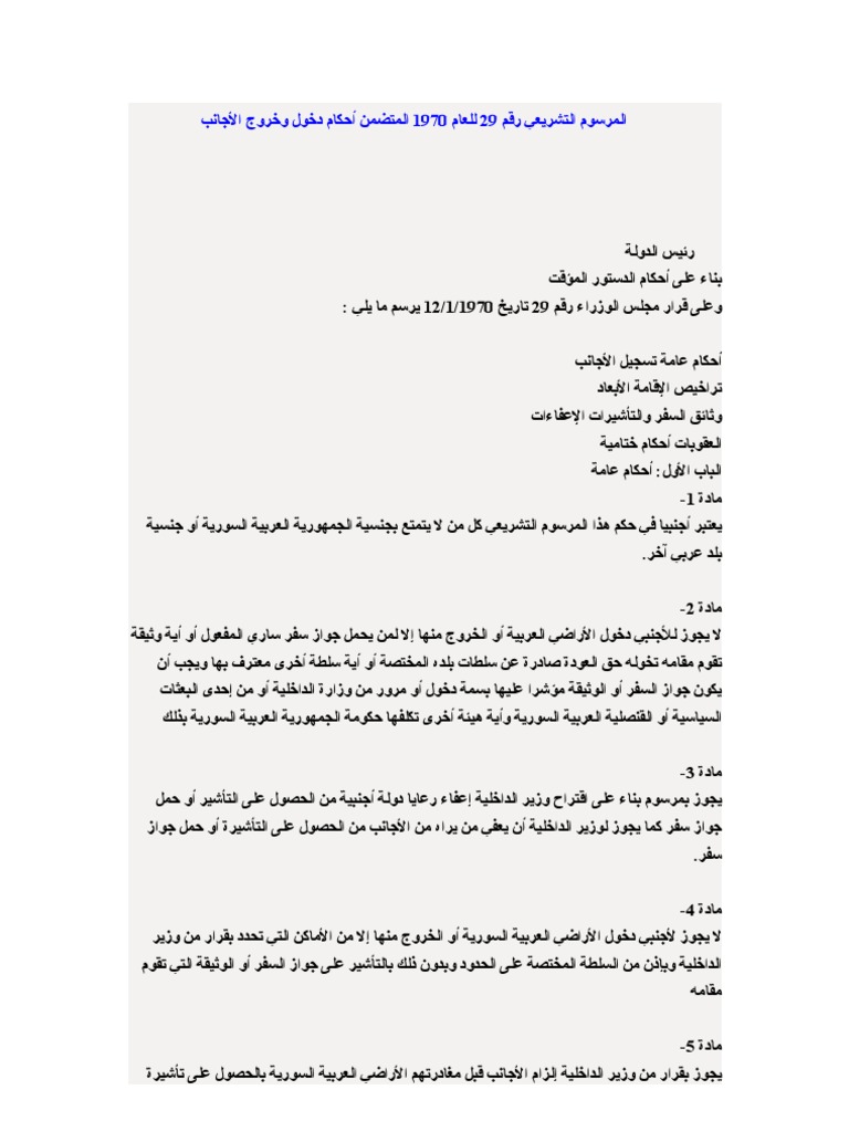 المرسوم رقم 29 للعام 1970 الخاص بأحكام دخول وخروج الأجانب السوري