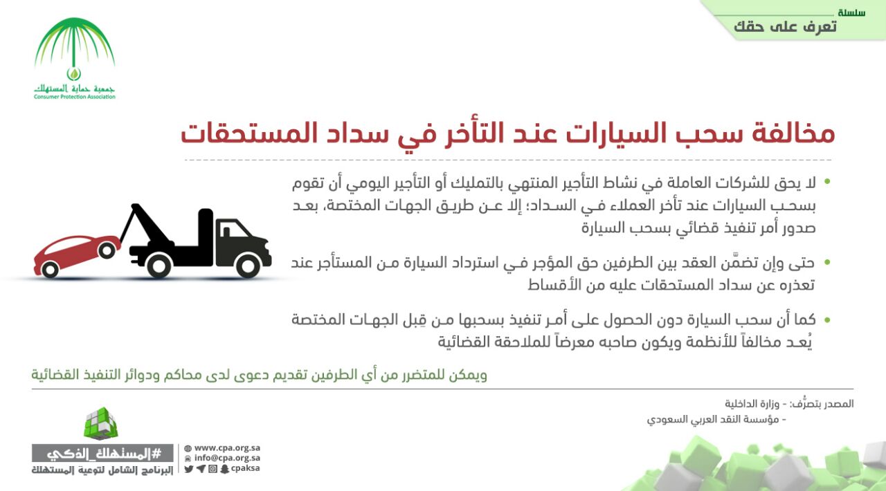 جمعية حماية المستهلك Ar Twitter لا يحق للشركات العاملة في نشاط التأجير المنتهي بالتمليك أو التأجير اليومي أن تقوم بسحب السيارات عند تأخر العملاء في السداد إلا بعد صدور أمر تنفيذ قضائي